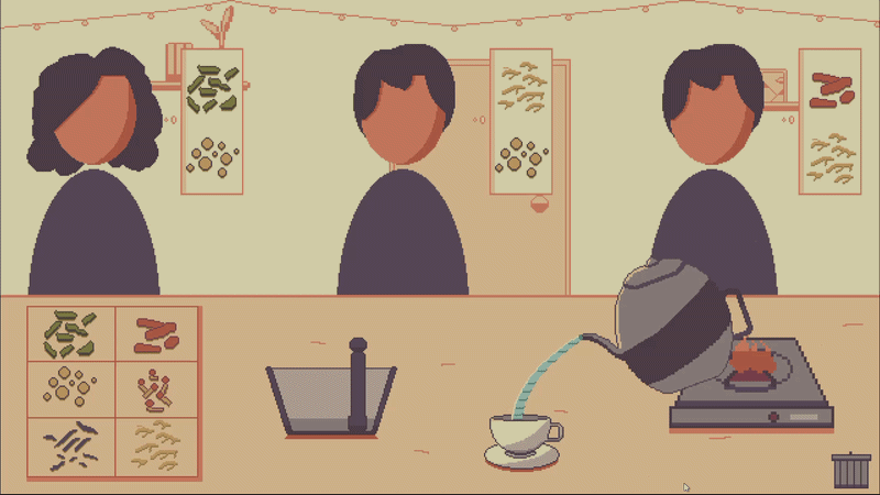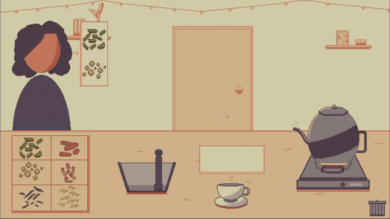 Tea Pls is a relaxing tea shop simulator. There is no end goal or scoring system—the only goal is to chill and serve some tea. This game was made for "Trijam 364," with the theme "No Stress, Just Vibes."